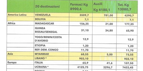 In questo prospetto puoi trovare il resoconto che riporta le destinazioni dei farmaci e quanti chilogrammi abbiamo spedito.