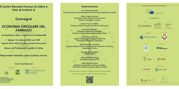 Si è svolto il 12 ottobre 2024 il primo convegno organizzato dalla nostra associazione, grazie al contributo del Comune di Udine, u.o. Città Sane, che ha trattato il tema "economia circolare del farmaco, una questione etica, economica e sociale. Hanno presenziato i relatori: prof.Massimo Baraldo, dott. Federico Armani, dott. Franco Lo Mauro, prof. Ariela Benigni, dott. Mario Canciani, dott. Edoardo Leombruni, dott.ssa Livia Arreghini, dott.ssa Michela Vogrig, dott. Massimo Sivieri.